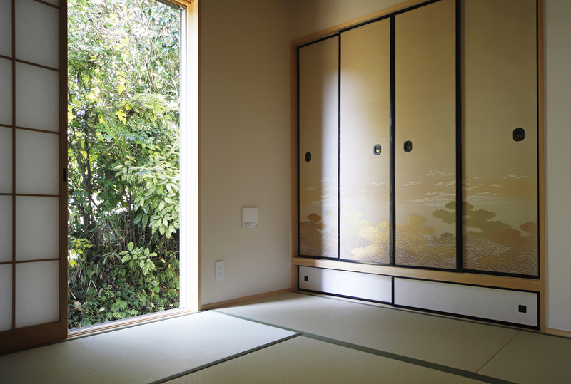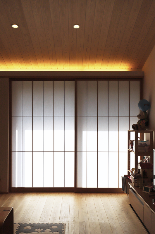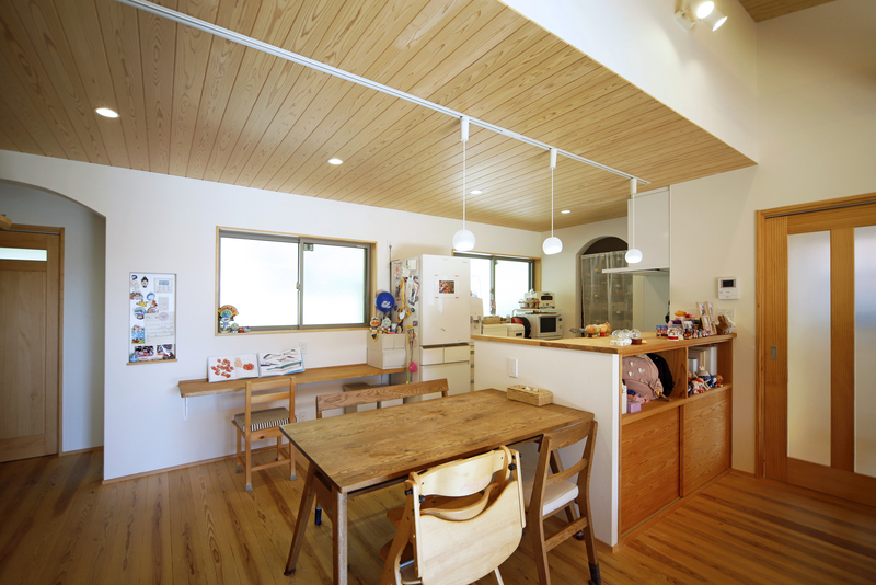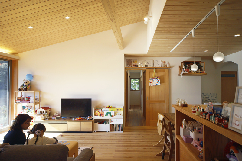 田園風景の中に建つ子育て世帯の平屋。 敷地内の離れと調和する、瓦屋根と塗り壁の外観。 リビングは小上がりの畳スペースがあり、あらわし梁と勾配天井が開放的でありながら深い軒や障子の設えで落ち着いた空間になりました。 開口部の障子を引き込めば緑豊かな景色と、春には桜が楽しめます。