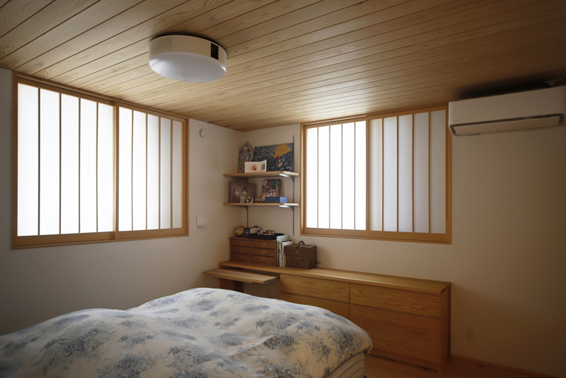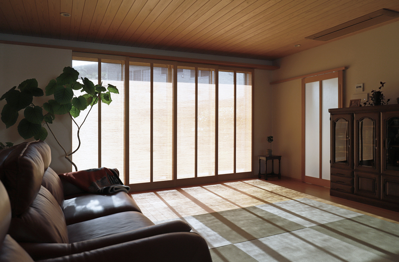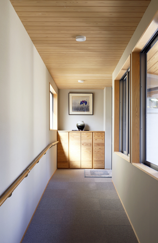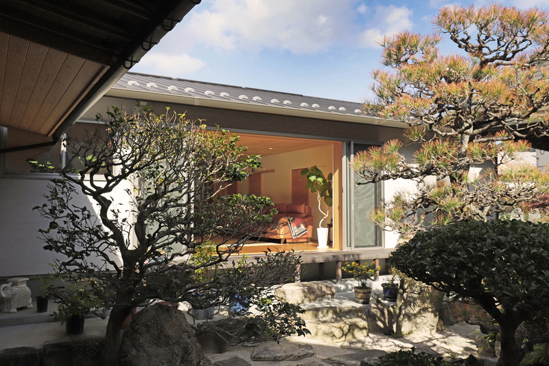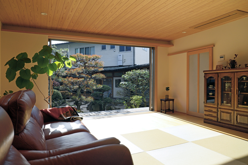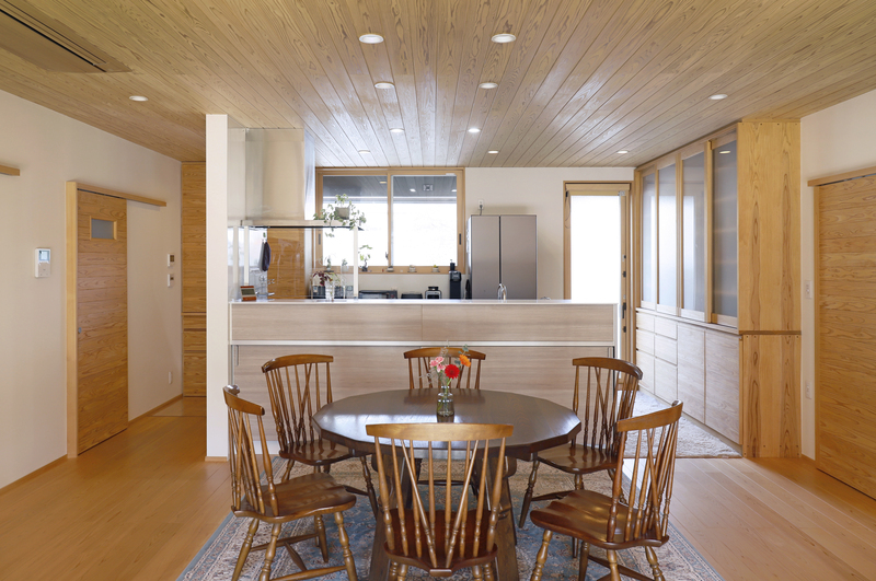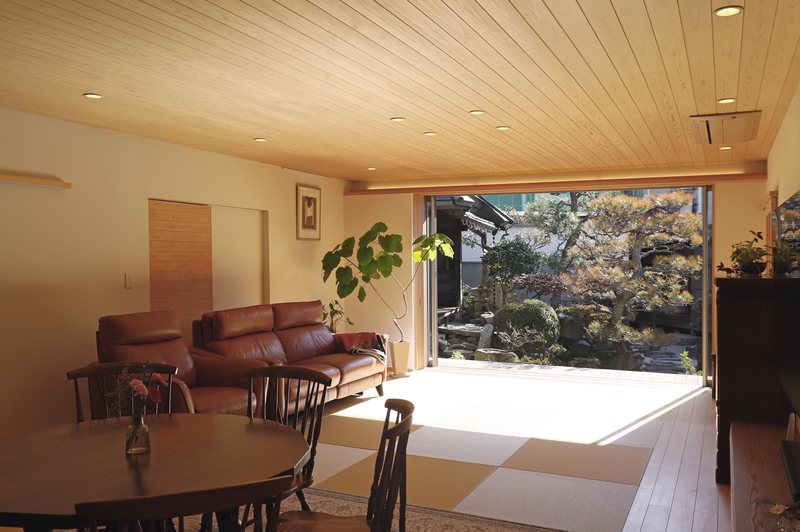 ゆったりと過ごせる畳リビングの平屋。 竹ひごを編み込んだ建具を開けると、緑鮮やかお庭が楽しめます。キッチン収納や造作カウンターの製作家具など、職人の手しごとが詰まったお住まいになりました。コンパクトにまとめた水回りや、回遊できる動線、暮らしやすさにも工夫しています。